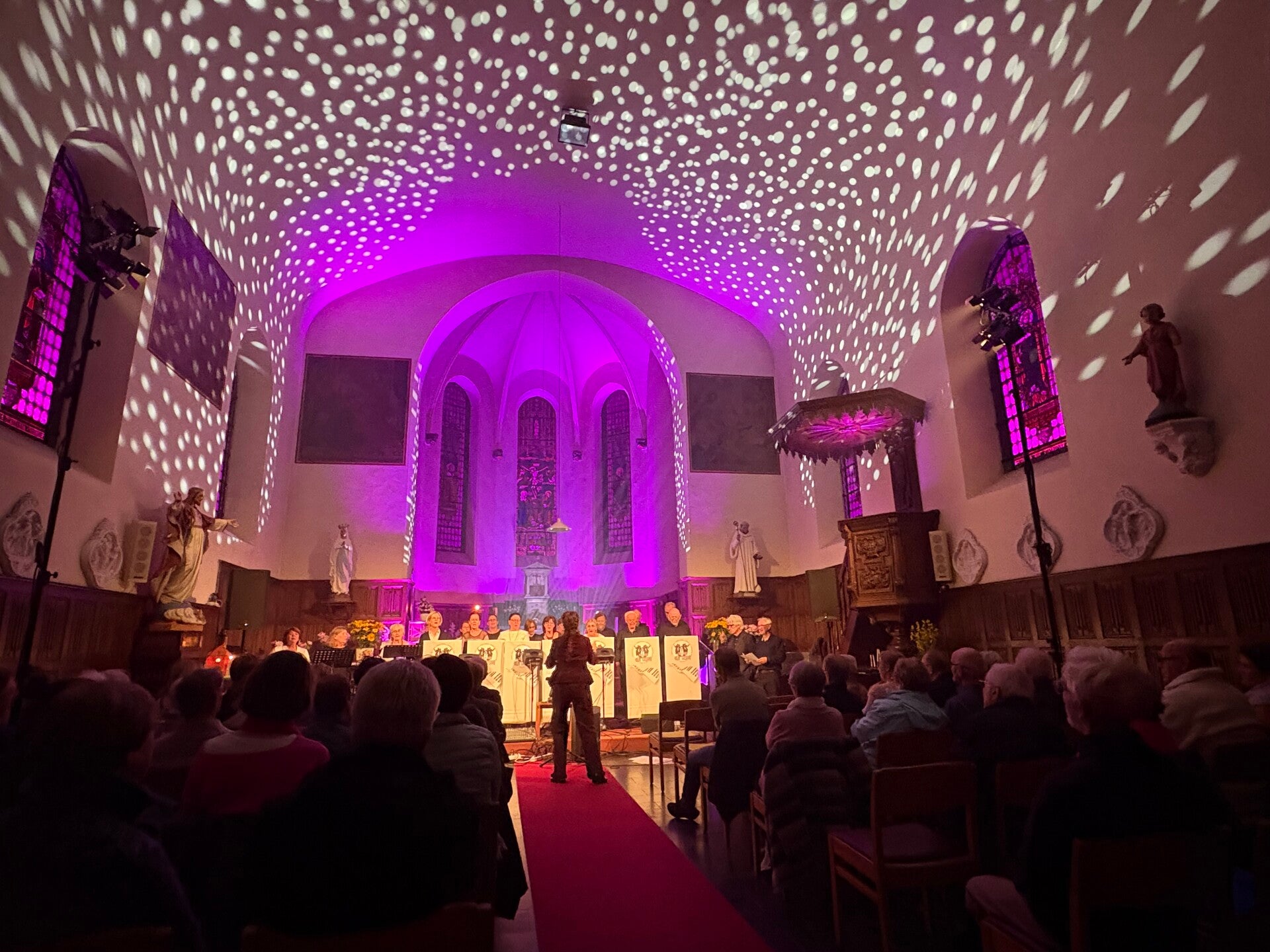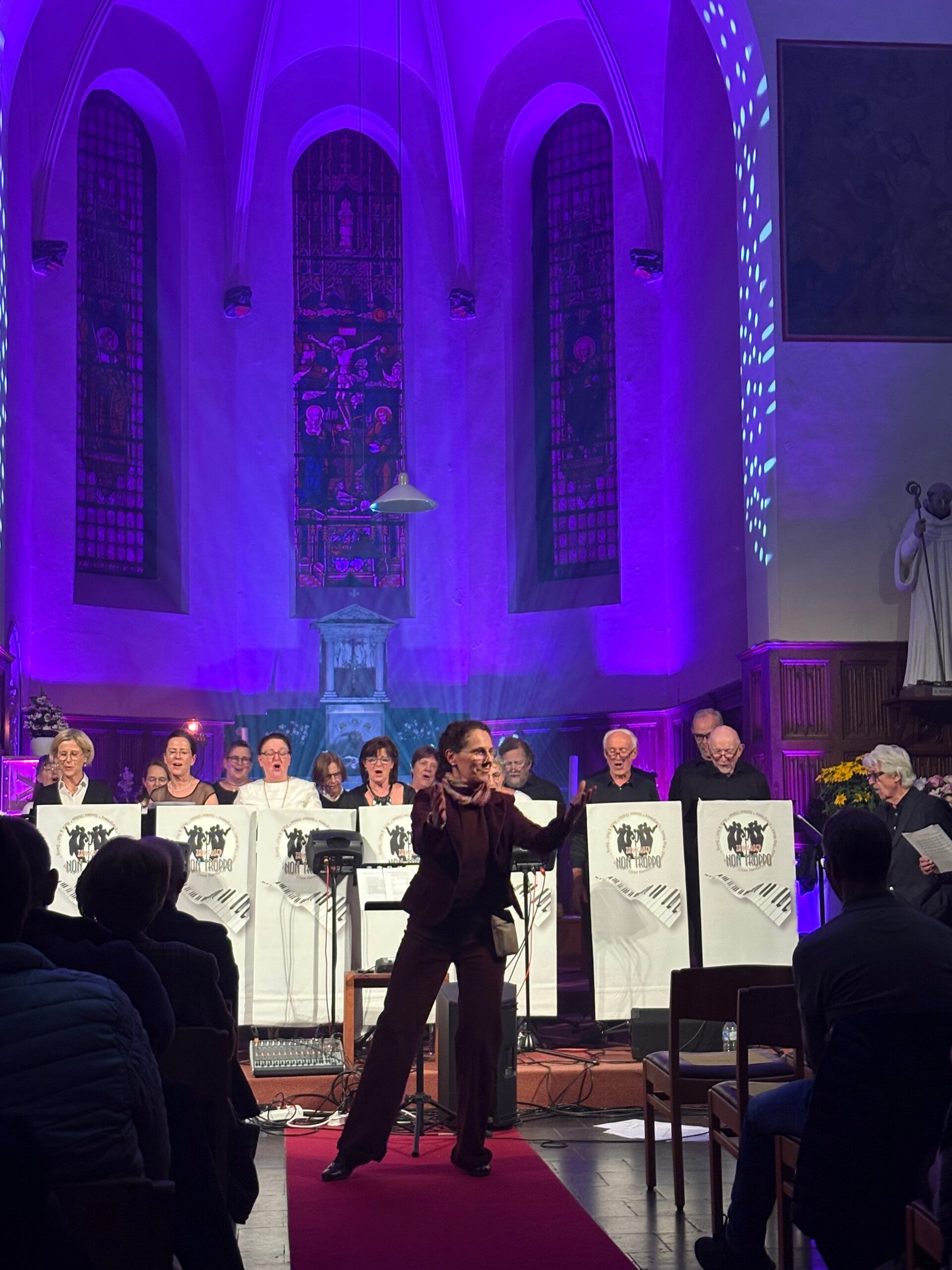 Dat een kerk niet alleen hoeft te dienen voor de eredienst werd duidelijk. De boodschap van onze kerk voor iedereen is: “wees er voor elkaar en maak mekaar gelukkig”. Die boodschap bracht ook het koor met het lied van Raymond van het Groenewoud: “Gelukkig zijn”. En ja het geweldige zangkoor, de goeie sfeer, de schalkse dirigent maakten éénieder gelukkig. Liedjes van Toto, Abba, de Radio’s, Raymond van het Groenewoud, Dua Lipa, Elton John, Kylie Minogue, Foreigner, enz. wisselden mekaar af. Gastdirigente, An, werd zo uit het publiek geplukt. Zij dirigeerde op volwaardige wijze het zangkoor voor het lied: